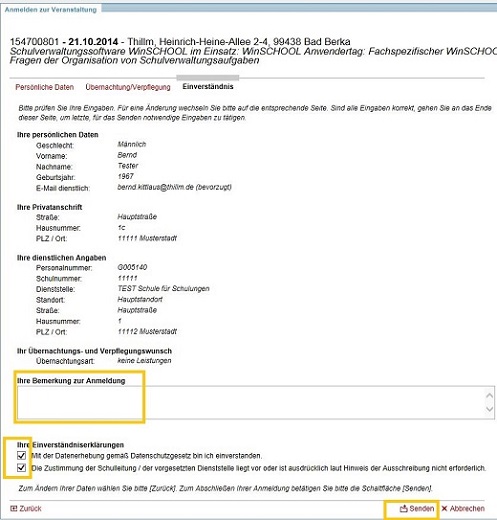 Wählen Sie zum Abschluss beide Einverständniserklärungen zur Datenerhebung und zur Zustimmung des Schulleiters aus und schließen Sie den Assistenten mit SENDEN ab. Bitte beachten Sie dabei, dass Ihre Anmeldung noch keine Zulassung zur Veranstaltung ist. Diese wird Ihnen vom Anbieter in der Regel über eine konkrete Einladung übermittelt.