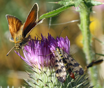 Das Foto gehört zur Serie "Schmetterlinge". Es zeigt einen Dickkopffalter (Hesperiidae). Dickkopffalter sind eine Familie der Schmetterlinge. Rechts daneben eine Skorpionsfliege (Panorpidae). Skorpionsfliegen sind eine Familie der Schnabelfliegen. Es gelten die Nutzungsbedingungen der Mediothek und Pixiothek.