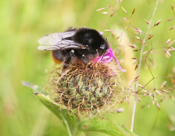 Das Foto hehört zur Serie "Hummeln". Es zeigt eine Steinhummel (Bombus lapidarius). Steinhummeln sind größtenteils schwarz, das Ende des Hinterleibs ist braunrot. Männliche Steinhummeln haben eine gelbe Binde auf der Brust. Ihre Nester legen sie unter Steinhaufen oder Mauern an. Es gelten die Nutzungsbedingungen der Mediothek und Pixiothek.