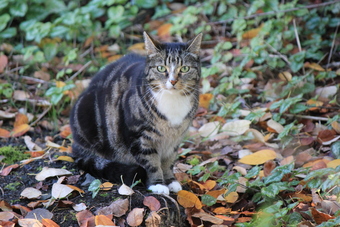 Hauskatze zwischen Blättern