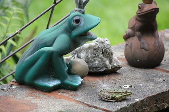 Das Foto gehört zur Serie "Froschlurche". Es zeigt einen Teichfrosch (Pelophylax „esculentus“ oder Rana „esculenta“) neben Fröschen aus Keramik und Metall. Das Bild ist unter CC0 lizenziert und kann somit frei verwendet werden.