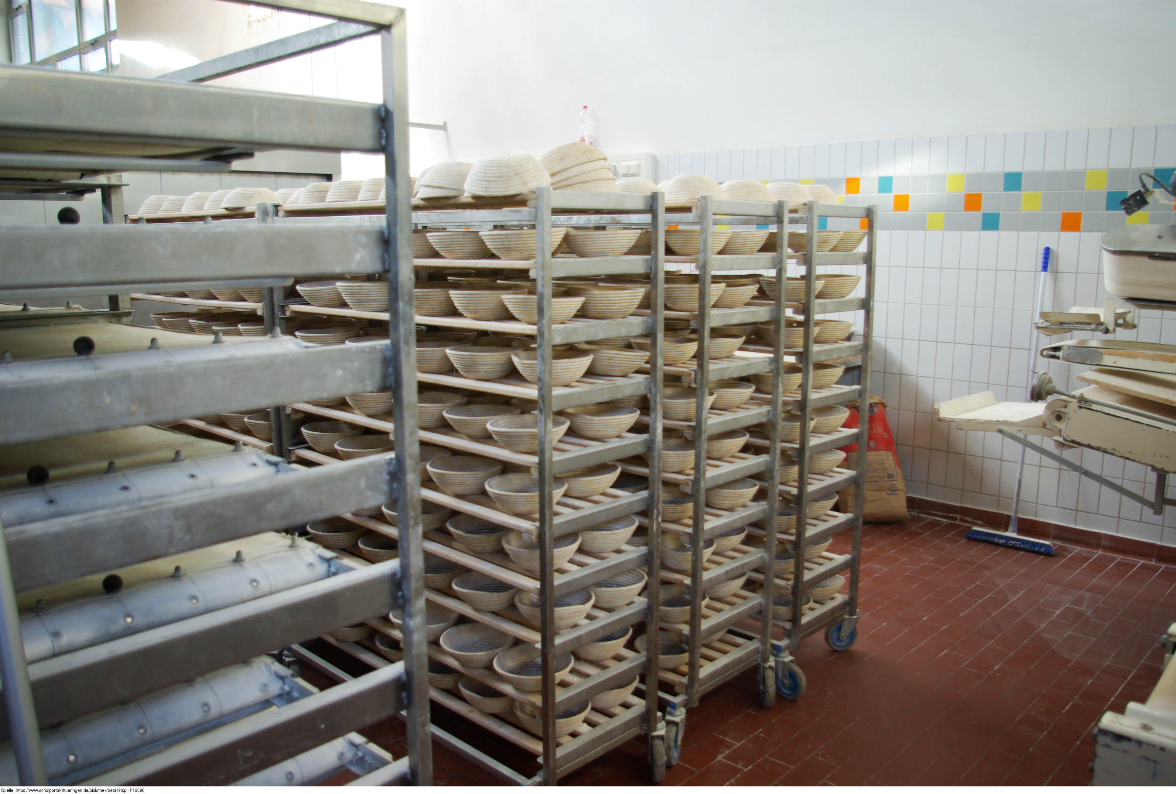 Das Bild zeigt Technik in einer Bäckerei. Zu sehen sind Gärkörbchen für Brotteig in Backregalen mit Rollen. Das Bild ist unter CC0 lizenziert und kann somit frei verwendet werden.