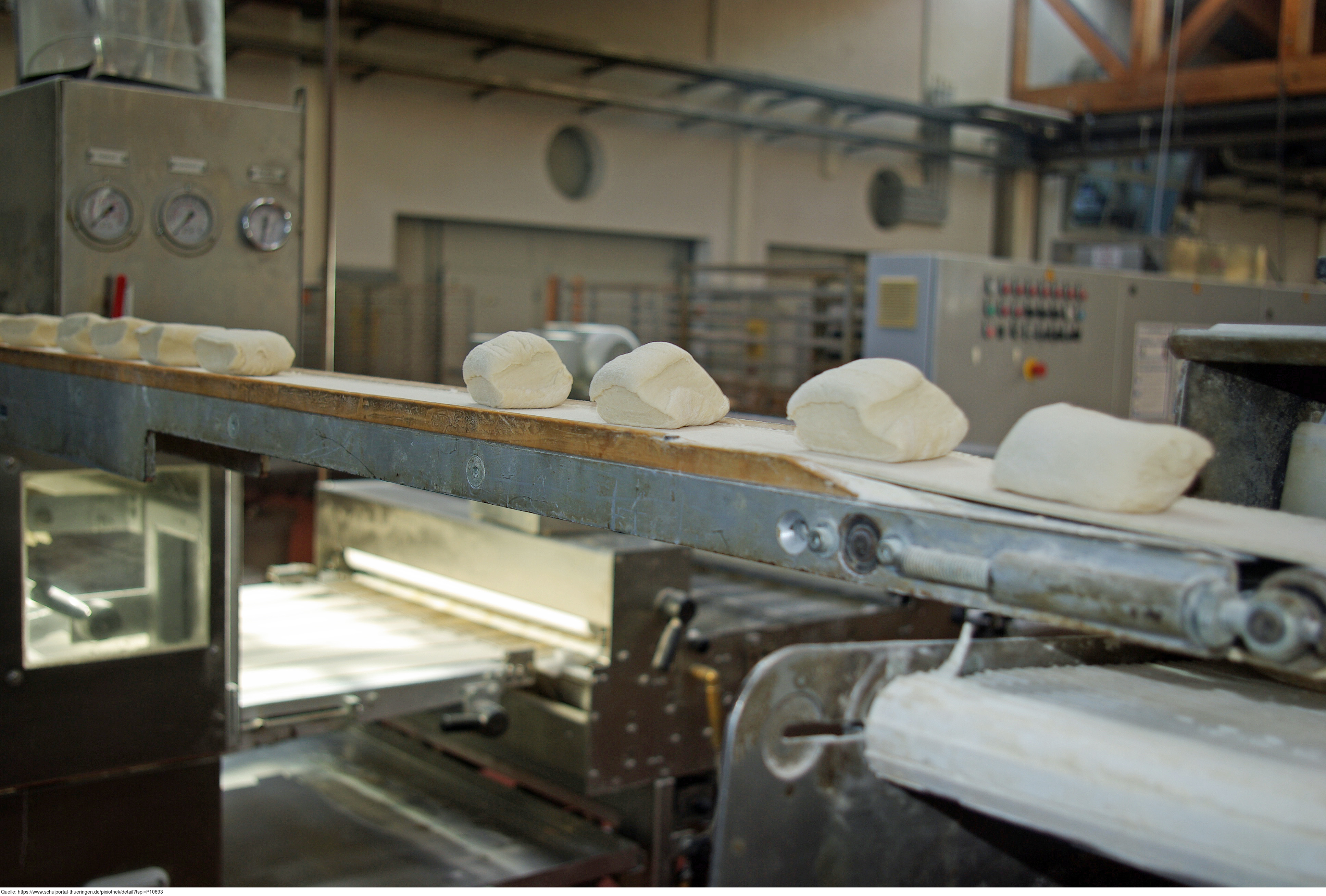 Das Bild zeigt Technik in einer Bäckerei. Zu sehen ist ein Förderband mit Teigportionen. Das Bild ist unter CC0 lizenziert und kann somit frei verwendet werden.