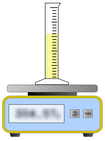 Waage mit Messzylinder und gelber Flüssigkeit
