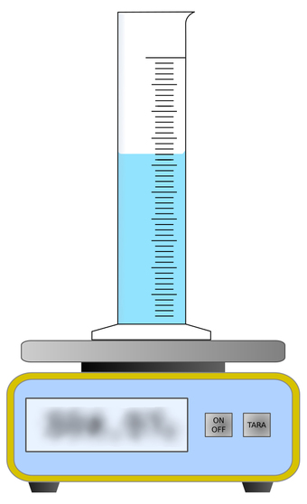 Waage mit Messzylinder und blauer Flüssigkeit