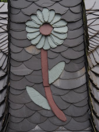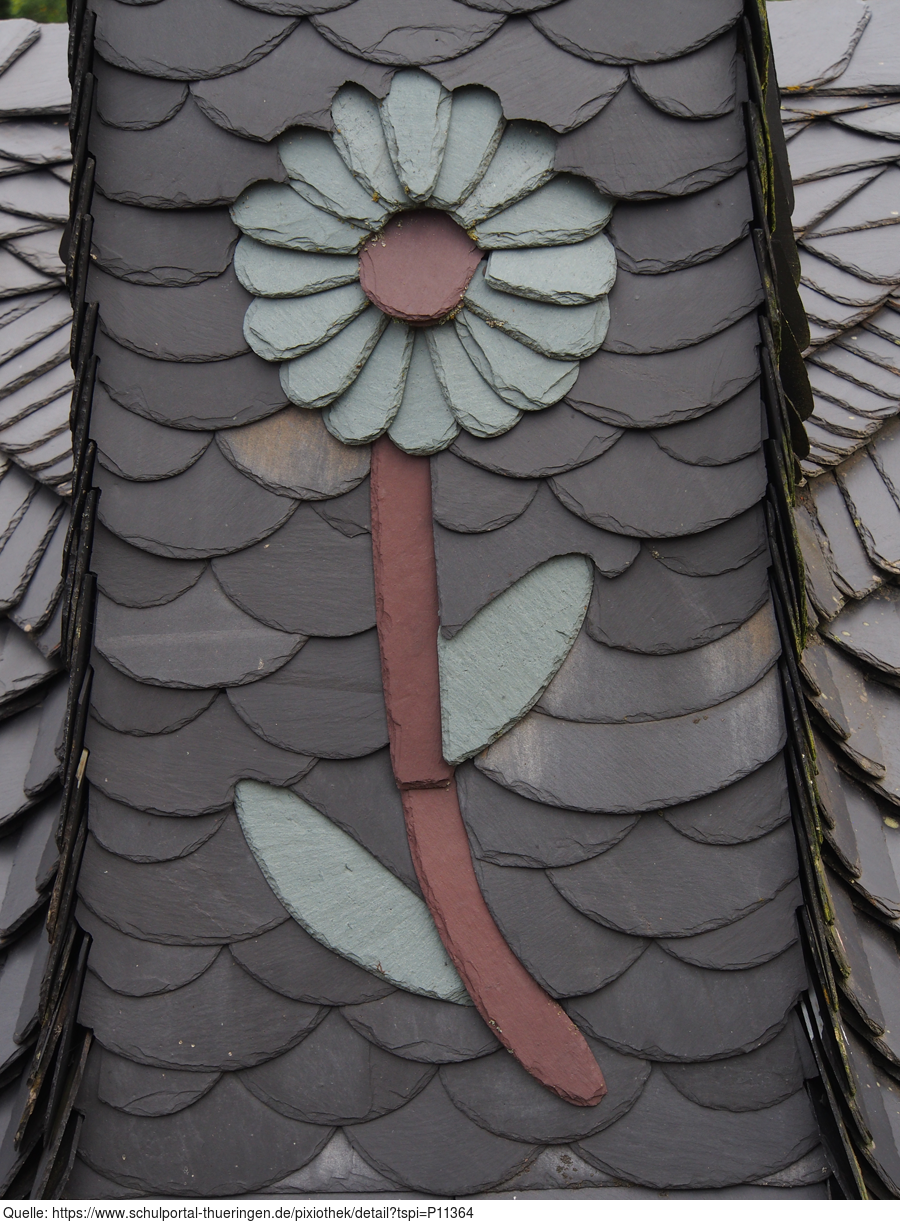 Das Bild gehört zur Serie "Thüringischer Schieferpark Lehesten". Es zeigt ein aus Schiefer gefertigtes Ornament am technischen Denkmal. Es gelten die Nutzungsbedingungen der Mediothek und Pixiothek.