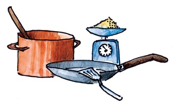Das Bild gehört zur Serie "Hauswirtschaft". Es zeigt gezeichnete Küchenutensilien als Symbolbild für Hauswirtschaft. Es gelten die Nutzungsbedingungen der Mediothek und Pixiothek.