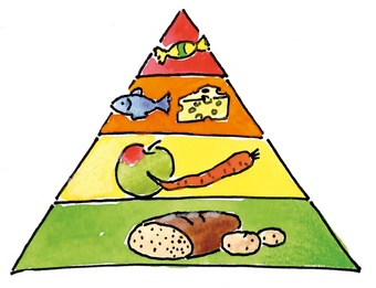 Das Bild gehört zur Serie "Hauswirtschaft". Es zeigt eine gezeichnete Ernährungspyramide als Symbolbild für Hauswirtschaft. Es gelten die Nutzungsbedingungen der Mediothek und Pixiothek.