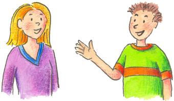 Das Bild gehört zur Serie "Kinder". Es zeigt einen gezeichneten Jungen und ein Mädchen im Gespräch. Es gelten die Nutzungsbedingungen der Mediothek und Pixiothek.