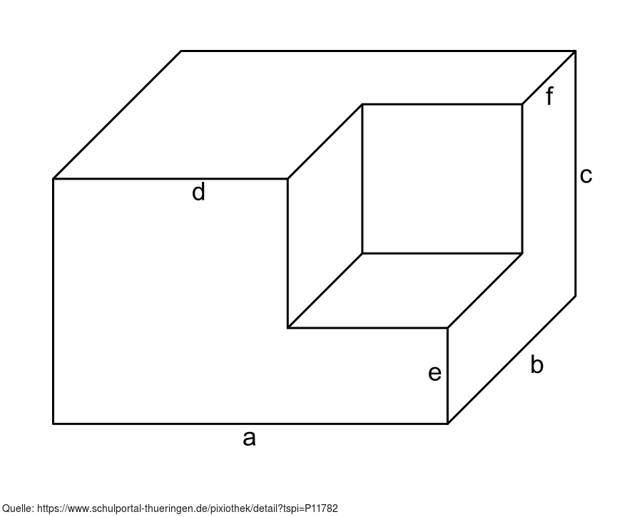 Das Bild gehört zur Serie "Geometrie Körper". Es zeigt einen aus zwei Quadern zusammengesetzten Körper. Bei Vorgabe von Maßangaben für die bezeichneten Seiten kann das Gesamtvolumen berechnet werden. Das Bild ist unter CC0 lizenziert und kann somit frei verwendet werden.