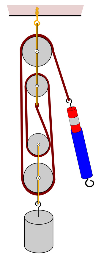 Das Bild gehört zur Serie "Physik, Mechanik". Es zeigt einen Flaschenzug (vier tragende Seile) mit angehängtem Massenstück und Federkraftmesser. Das Bild ist unter CC0 lizenziert und kann somit frei verwendet werden.