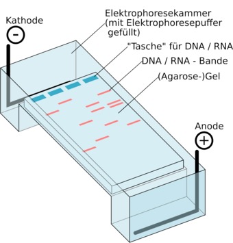 Beschriftete Skizze einer Elektrophoresekammer zur Elektrophorese eines DNA- oder RNA-Agarosegels.