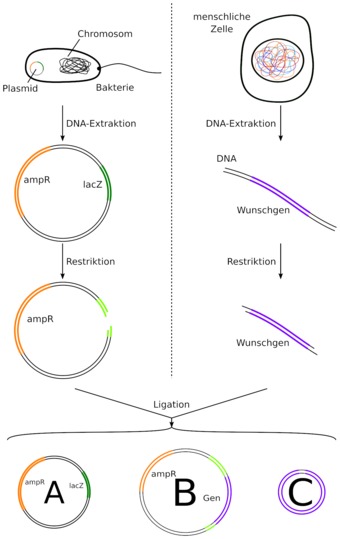 Schematischer Ablauf einer Bakterien-Klonierung mittels Blau-Weiß-Screening (ampR, lacZ).