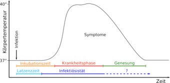 Ablauf einer Infektionskrankheit mit Bezeichnung der einzelnen Phasen (nach Symptomatik bzw. Infektiösität). Es gelten die Nutzungsbedingungen der Mediothek und Pixiothek. Auf http://unterricht.petzinger.net/biochdropbox.html auch als svg und in CC-BY verfügbar.