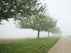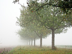 Straße mit Apfelbäumen im Nebel