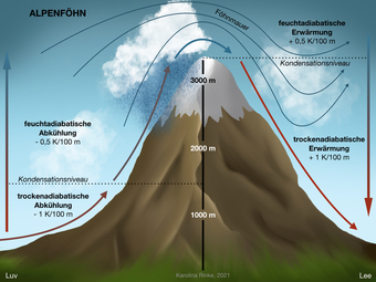 Das Bild gehört zur Serie "Grafische Darstellung Alpenföhn". Das Bild verdeutlicht den Alpenföhn (Föhnwind des Alpenraumes). Bild-Variante: Berg mit Wolken und Niederschlag; farbig; beschriftet. Es gelten die Nutzungsbedingungen der Mediothek und Pixiothek.