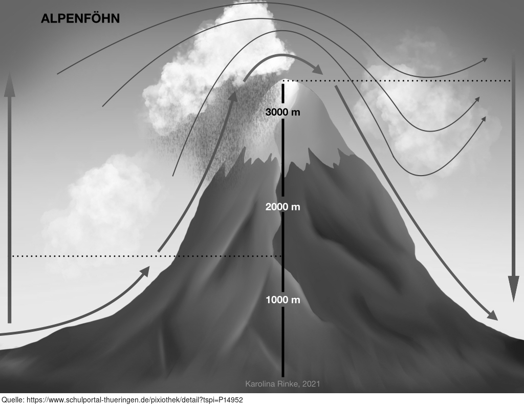 Das Bild gehört zur Serie "Grafische Darstellung Alpenföhn". Das Bild verdeutlicht den Alpenföhn (Föhnwind des Alpenraumes). Bild-Variante: Berg mit Wolken und Niederschlag; s/w; mit Pfeilen zur Beschriftung. Es gelten die Nutzungsbedingungen der Mediothek und Pixiothek.