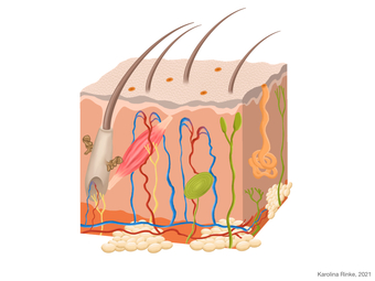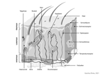 Das Bild gehört zur Serie "Organe des Menschen". Das Bild verdeutlicht den Aufbau der menschlichen Haut. Bild-Variante: farbig; unbeschriftet. Es gelten die Nutzungsbedingungen der Mediothek und Pixiothek.