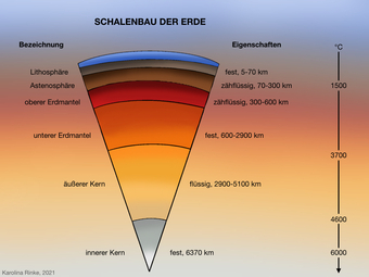 Das Bild verdeutlicht den Schalenaufbau der Erde. Bild-Variante: farbig; beschriftet. Es gelten die Nutzungsbedingungen der Mediothek und Pixiothek.