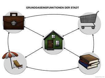 Das Bild verdeutlicht die Grunddaseinsfunktionen (der Stadt). Bild-Variante: farbig; unbeschriftet. Es gelten die Nutzungsbedingungen der Mediothek und Pixiothek.