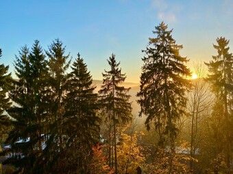 Das Bild zeigt einen herbstlichen Sonnenaufgang im Weimarer Land in Thüringen. Es gelten die Nutzungsbedingungen der Mediothek und Pixiothek.