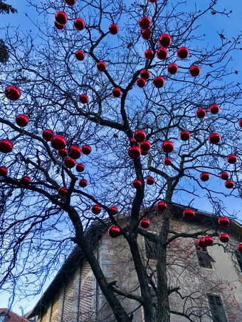 Weihnachtliche Dekoration mit Kugeln an einem Baum. Es gelten die Nutzungsbedingungen der Mediothek und Pixiothek.