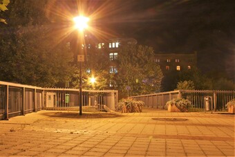 Motiv eines Stadtrundganges durch Pößneck (Ostthüringen) bei Nacht. Standort Ernst-Thälmann-Straße, Einfahrt Brunnengasse im Rücken. Blick über eine Kotschau-Brücke zum Lehrlingswohnheim. Es gelten die Nutzungsbedingungen der Mediothek und Pixiothek.