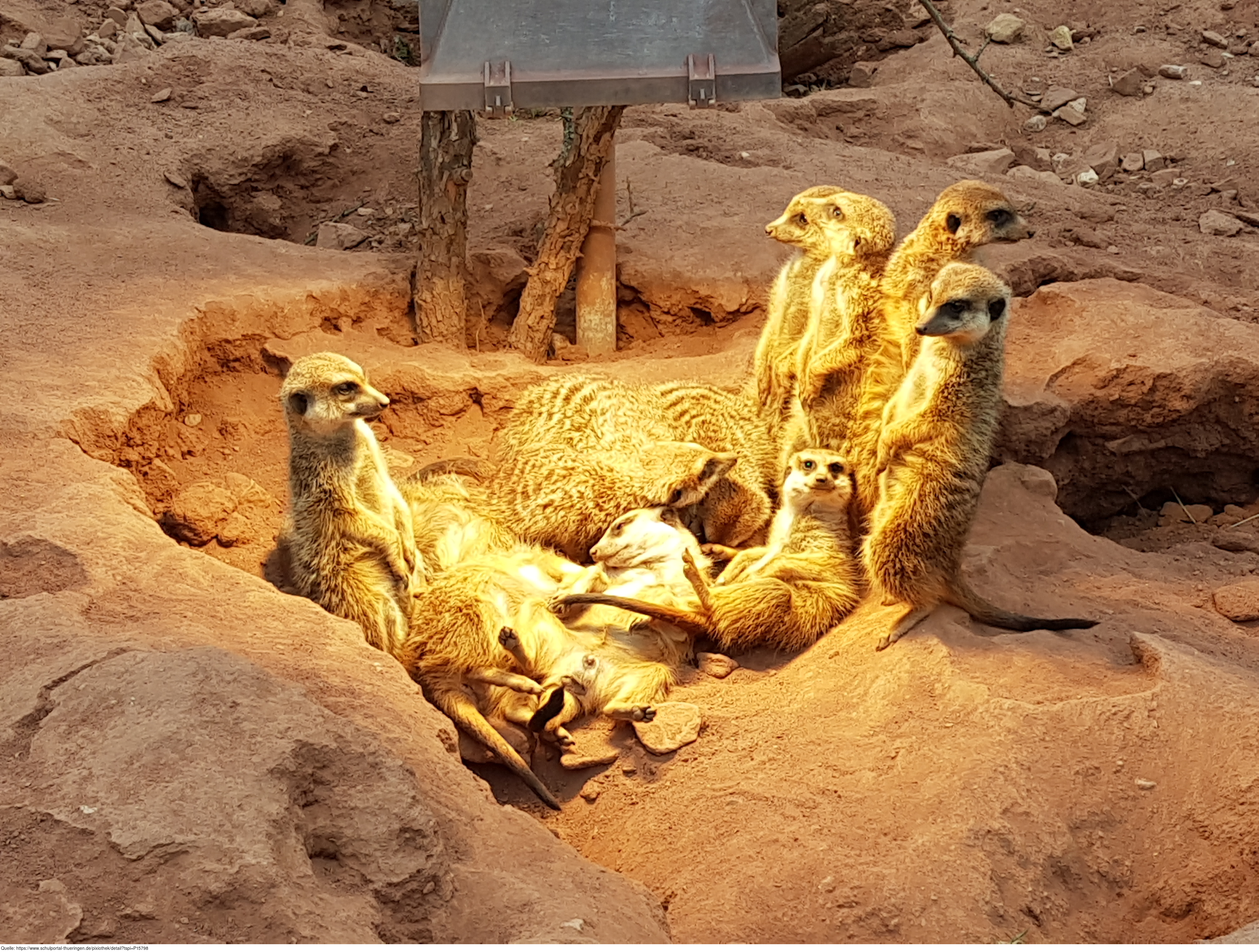 Auf dem Foto abgebildet sind Erdmännchen unter einer Wärmequelle.. Es gelten die Nutzungsbedingungen der Mediothek und Pixiothek.