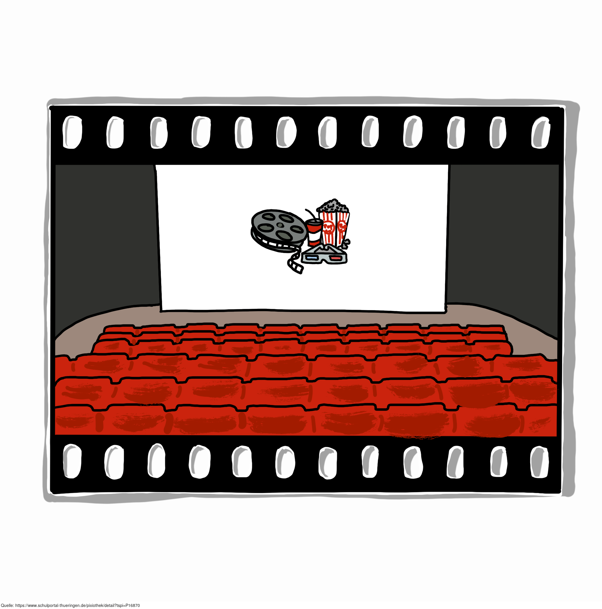 Das Bild zeigt einen gezeichneten Kinosaal mit Leinwand. Das Bild ist unter CC0 lizenziert und kann somit frei verwendet werden.