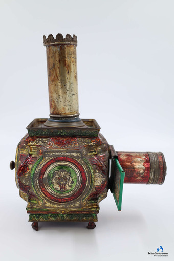 Abgebildet ist eine Laterna magica aus der Sammlung des Schulmuseums Friedrichshafen. Sie stammt aus der Mitte des 19. Jahrhunderts und hat ein reich verziertes, buntes Metallgehäuse. Auf den zugehörigen Glasbildern sind Szenen aus dem Märchen „Der Rattenfänger von Hameln“ abgebildet. Weitere Erläuterungen zum Bild unter https://schulmuseum.friedrichshafen.de/das-museum/ausstellungen/objekt-des-monats/detailseite/news/laterna-magica-aus-dem-19-jahrhundert/.