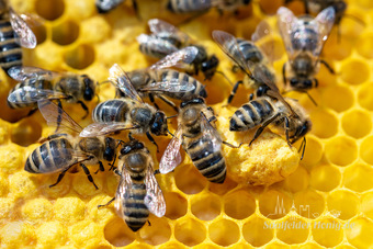 Das Bild gehört zur Serie "Saalfelder Honig", aufgenommen vom Imker Bernd Rümpler, Inhaber von saalfelder-honig.de. Zu sehen sind Arbeiterbienen (Stockbienen) bei der Brutpflege (zentral im Bild eine Weiselzelle oder Nachschaffenszelle für eine Königin). Es gelten die Nutzungsbedingungen der Mediothek und Pixiothek.
