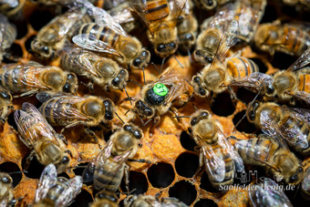 Bienenkönigin umringt von Arbeiterinnen