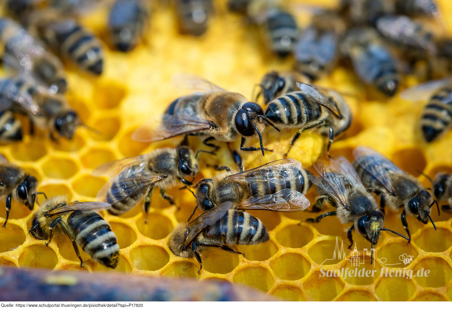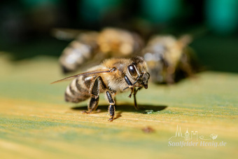 Das Bild gehört zur Serie "Saalfelder Honig", aufgenommen vom Imker Bernd Rümpler, Inhaber von saalfelder-honig.de. Zu sehen ist eine Biene (Arbeiterin) am Flugloch. Es gelten die Nutzungsbedingungen der Mediothek und Pixiothek.