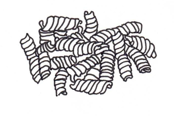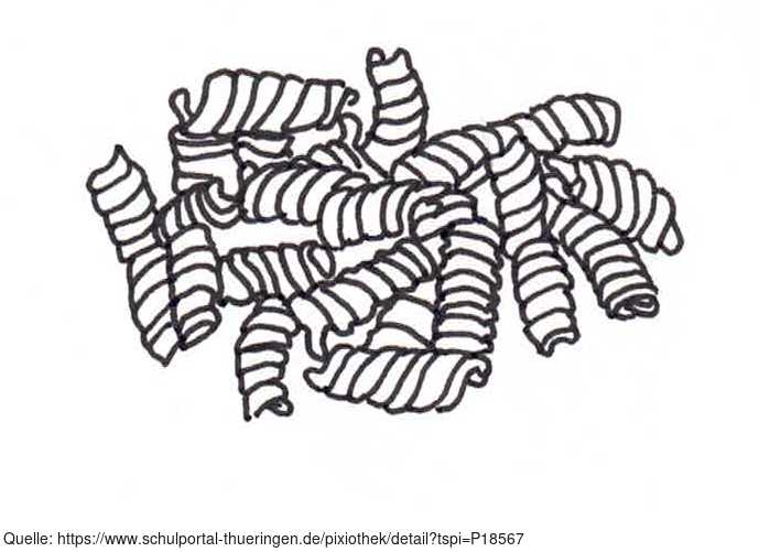 Das Bild zeigt gezeichnete Nudeln, Fusilli (s/w). Es gehört zur Serie "Ernährungspyramide zum Basteln und Gestalten" und findet u.a. im gleichnamigen Lernobjekt unter https://www.schulportal-thueringen.de/web/guest/media/detail?tspi=18517 Verwendung. Es gelten die Nutzungsbedingungen der Mediothek und Pixiothek.