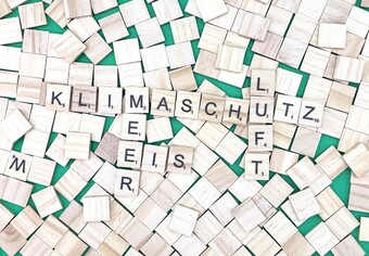 Aus Buchstaben wurden die Begriffe "Klimaschutz", "Meer", "Eis" und "Luft" gelegt. Es gelten die Nutzungsbedingungen der Mediothek und Pixiothek.