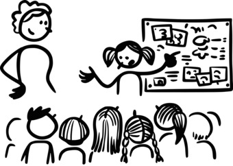 Die Zeichnung zeigt eine Schülerin beim Präsentieren oder Erläutern vor der Klasse. Die Lehrerin steht neben ihr. Das Bild ist unter CC0 lizenziert und kann somit frei verwendet werden. Es ist neben weiteren Bildern auch hier zu finden: https://cocomaterial.com
