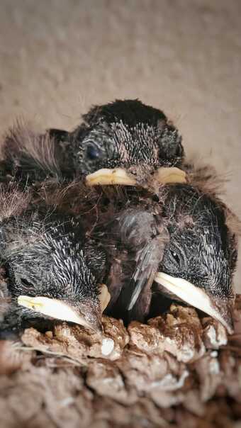 Das Foto gehört zur Serie "Schwalbenfreundliches Haus". Es zeigt junge Rauchschwalben im Nest. Das Nest befindet sich in einer Scheune, die für Vögel und Fledermäuse einige offene Durchflugsmöglichkeiten bereithält. Es gelten die Nutzungsbedingungen der Mediothek und Pixiothek.
