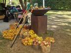 Das Bild zeigt eine Ansicht auf dem ApfelGut Erfurt. Auf einem Tisch mit einer blau-weiß karierten Tischdecke stehen Gläser, Karaffen und Äpfel bereit. Im Hintergrund befindet sich ein Holzzaun, der das Areal begrenzt. Es gelten die Nutzungsbedingungen der Mediothek und Pixiothek.