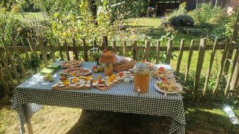Das Bild zeigt eine Ansicht auf dem ApfelGut Erfurt. Auf einem Tisch im Freien befindet sich ein zum Thema Apfel bzw. Streuobstwiese passend angerichtetes Buffet. Es gelten die Nutzungsbedingungen der Mediothek und Pixiothek.