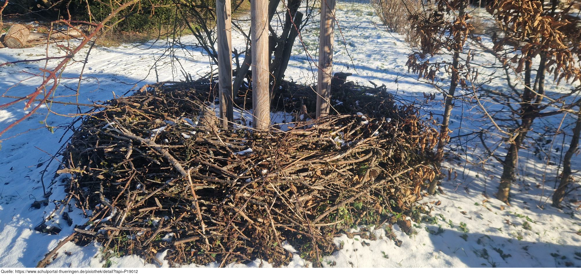 Das Bild zeigt ein Projektergebnis aus Totholz zum Thema Land Art auf dem ApfelGut Erfurt. Gleichzeitig werden so neue Lebensräume für unterschiedliche Tierarten geschaffen. Es gelten die Nutzungsbedingungen der Mediothek und Pixiothek.