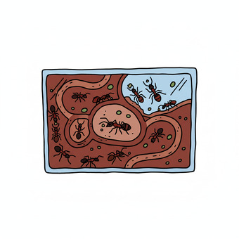 Das Bild zeigt eine gezeichnete Armeisenfarm. Das Bild wurde mittels einer KI (Gemini) erstellt und ist unter CC0 lizenziert. Weitere Bilder aus Herrn Emrich-Försters Bild-Archiv findet man hier: https://pix.foerster.rocks/