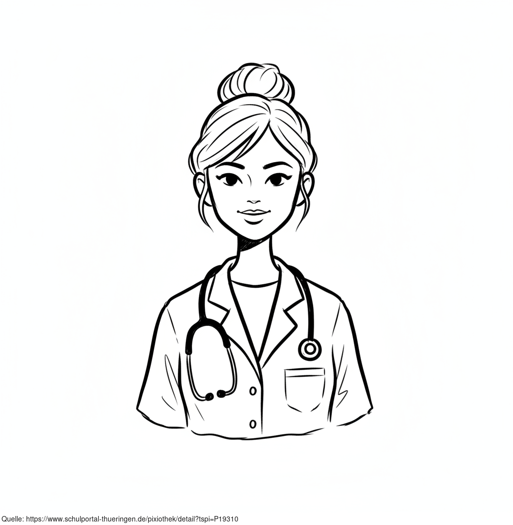 Das Bild zeigt eine gezeichnete Ärztin mit Stethoskop. Das Bild wurde mittels einer KI (Gemini) erstellt und ist unter CC0 lizenziert. Weitere Bilder aus Herrn Emrich-Försters Bild-Archiv findet man hier: https://pix.foerster.rocks/