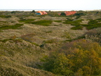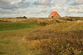 Abgebildet ist eine Dünenlandschaft mit Haus.