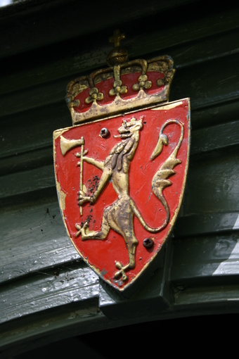 Abgebildet ist das Staatswappen Norwegens über einem Gebäudeeingang. Das Wappen ist eines der ältesten in Europa und war ursprünglich ein persönliches Wappen des Königs.