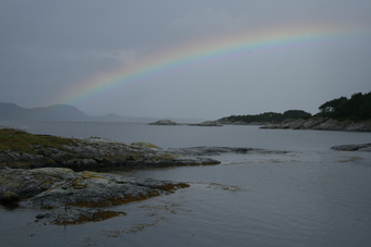 Abgebildet ist ein Regenbogen über dem Foerdefjord.