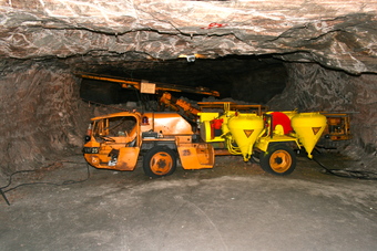 Das Foto gehört zur Serie "Salzbergwerk". Es zeigt ein Fahrzeug zum Füllen der Sprenglöcher. Es gelten die Nutzungsbedingungen der Mediothek und Pixiothek.
