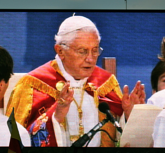 Abgebildet ist die Benedikt XVI. beim Gebet (Videowand).