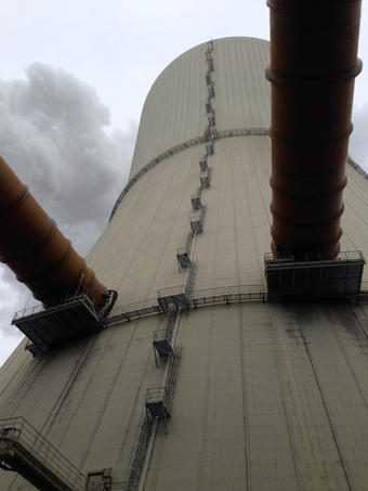 Das Foto gehört zur Serie "Braunkohlekraftwerk Lippendorf". Es zeigt die Zuführung der Rauchgasrohre in den Kühlturm. Es gelten die Nutzungsbedingungen der Mediothek und Pixiothek.