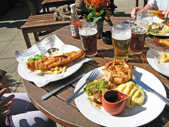Das Foto gehört zur Serie London 2016. Es zeigt links Fish and Chips (Fish ’n’ Chips) und weitere Angebote von der Speisekarte eines Ausflugsrestaurants an der Themse. Es gelten die Nutzungsbedingungen der Mediothek und Pixiothek.
