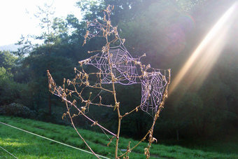 Das Bild gehört zur Serie "Sommerspaziergang". Es zeigt ein Spinnennetz mit Tautropfen. Es gelten die Nutzungsbedingungen der Mediothek und Pixiothek.